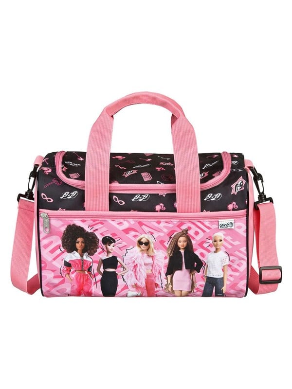 Sort/lyserød sportstaske fra Barbie hvor begge opbevaringsrum kan lukkes med lynlås. Mål 35 x 16 x 23 centimeter.